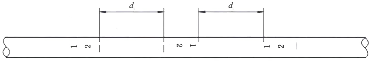 | 6-johtiminen sydämen tunnistus | 6.1 Eristeen värin tunniste: 6.1.1 Käytettäessä värillistä eristystä eristettyjen johdinsydämien tunnistamiseen, kukin eristetty johdinsydän saa käyttää vain yhtä väriä vihreän/keltaisen yhdistelmäväriä lukuun ottamatta. 6.1.2 Monen johdinkaapelin eristyssydänvärit eivät voi olla vihreää ja keltaista, jotka eivät ole yhdistettyjä värejä. 6.1.2 Vihreä/keltainen eristetyissä johdinsydämissä yhden värin tulee peittää vähintään 30 % ja enintään 70 % eristetyn johdinsydämen pinnasta ja toisen värin tulee peittää loput ja olla kauttaaltaan yhtenäinen. 6.1.4 Suositeltu värispektri enintään viisijohtimien kaapelien eristysvärjäyksissä on seuraava: 2 ydintä: ei haluttua värispektriä; 3 ydintä: vihreä/keltainen, sininen, ruskea tai sininen, musta, ruskea; 4 ydintä: vihreä/keltainen, sininen, musta, ruskea tai sininen, musta, ruskea, harmaa tai oranssi; 5-ytiminen: vihreä/keltainen, sininen, musta, ruskea, harmaa tai oranssi tai sininen, musta, ruskea, harmaa, oranssi tai muita eri värejä. 6.1.5 Kun kromatografialle on erityisiä vaatimuksia, kysynnän ja tarjonnan osapuolet voivat neuvotella ja määrittää asiakkaan vaatimusten mukaisesti. 6.2 Eristeen digitaalinen tunnistus: 6.2.1 Kaapelit, joissa on seitsemän tai useampia johtimia, merkitään numeroilla. Eristeen tulee olla samanvärinen ja järjestettävä numeerisesti sisäkerroksesta ulkokerrokseen luonnollisessa järjestyksessä alkaen nro 1 eristetystä ytimestä (suositus on musta eriste valkoisella kirjaimilla), paitsi vihreä/keltainen eristetty sydän (jos sellainen on). 6.2.2 Kun merkki koostuu yhdestä numerosta, numeron alle tulee lisätä vaakasuora viiva. Kun merkki koostuu kahdesta numerosta, ne on asetettava pystysuoraan ja jälkimmäisen numeron alle on lisättävä vaakasuora viiva. Kahden vierekkäisen numeroryhmän välinen väli di ei saa olla suurempi kuin 50 mm. Digitaalisten tunnistusmerkkien järjestely näkyy alla olevassa kuvassa: |